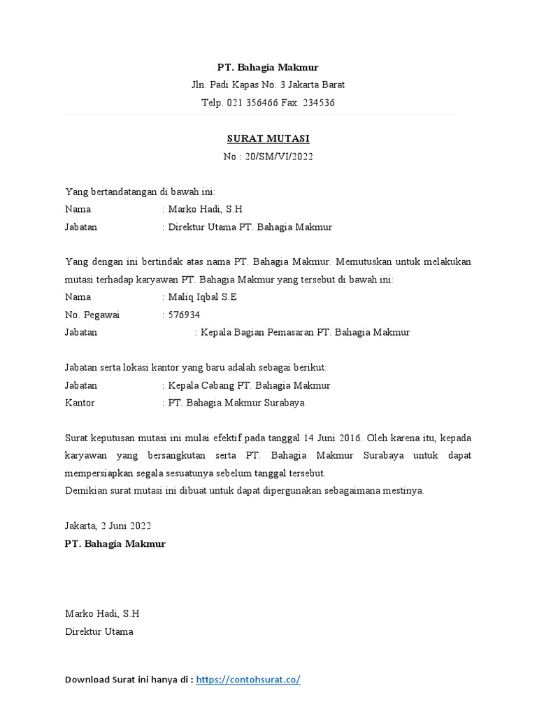 369 Contoh Surat Pindah Tugas Karyawan Swasta Amp Contoh Surat Perintah Mutasi Kerja Pdf